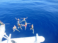 Et puis on va se recoucher, Denis et Mickaël lancent les lignes pour pêcher, notre dernière prise date déjà de 2 jours et puis la panique règne la plupart du temps à propos de : "qu'est-ce qu'on va manger???!!!"suivi d'un silence angoissé, alors qu'on se gave au-delà de toute limite afin de ne pas laisser perdre le frais. Pour exemple : comment ne pas perdre une banane qui brunit de manière intempestive. D'abord réquisition du matelot Mickaël The First, qui vous empoigne un régime de bananes en perdition, le pèle derechef, gorge de beurre salé une poële de cantine, fait fondre 2 kg de chocolat pâtissier de l'autre main, rôtit des amandes de la troisième main. Quand les bananes sont dorées, il les arrose de rhum, met le feu (là, Michel et Séverine se jettent sur le hublot du carré pour l'ouvrir en gloussant) et on engloutit tout vite avant la tempête (le vent est à 2 de tension depuis 1 semaine, mais on ne sait jamais). Bon, les bananes sont sauvées et si vous n'aviez plus le mal de mer, vous en retrouvez les symptômes à vitesse grand V.